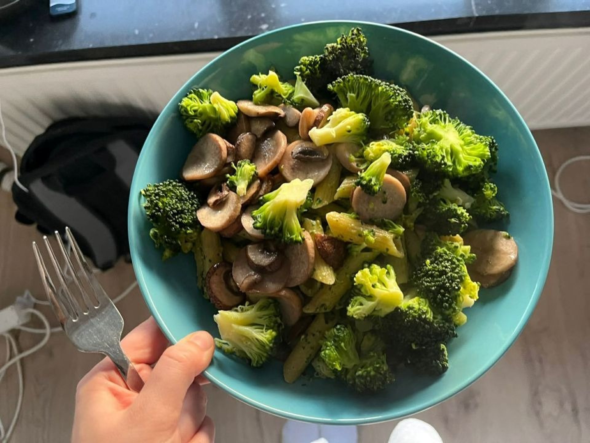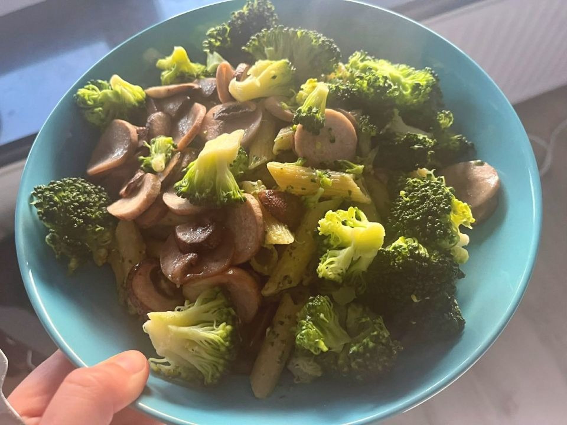 Kook de broccoliroosjes 4–5 minuten tot ze beetgaar zijn. Giet af en zet opzij.(Optioneel) Bak de paddenstoelen