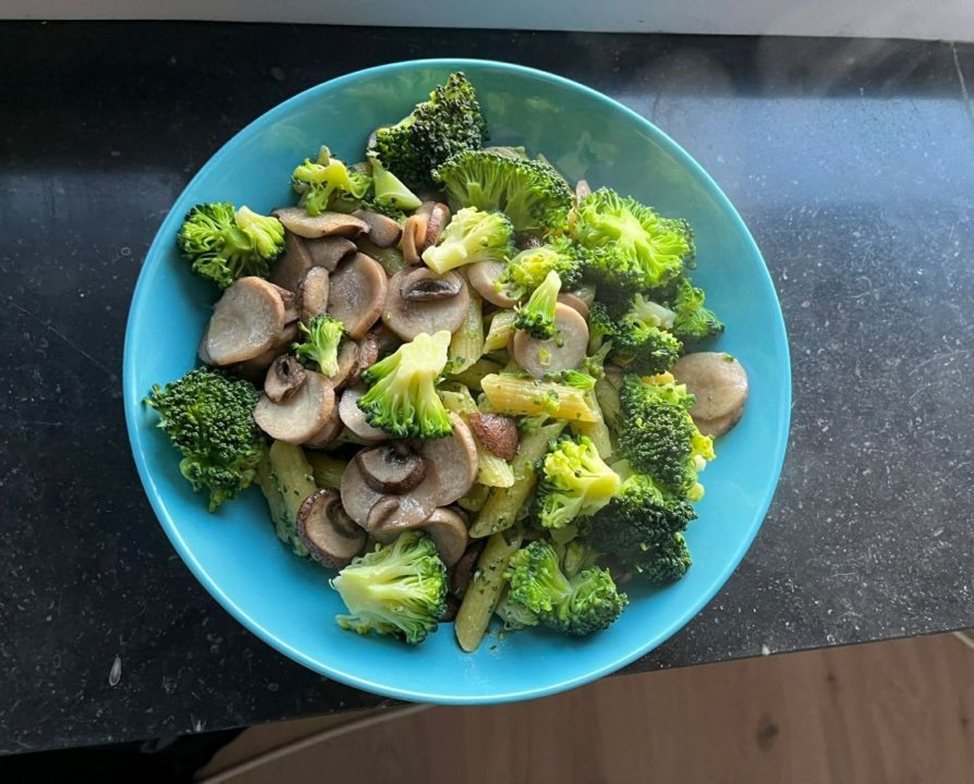 Meng de warme pasta met de pesto en broccoli (en eventueel de gebakken paddenstoelen). Voeg eventueel extra pastawater toe voor een mooi gebonden saus.Werk af